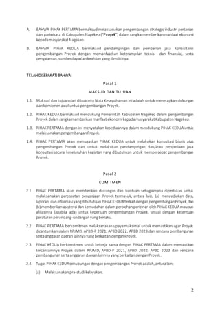 Nota kesepahaman antara Pemerintah Kabupaten Nagekeo dan PT Sajid Manajemen Kapital tentang pengembangan industri pertanian dan pariwisata di Kabupaten Nagekeo. Nota kesepahaman ini membahas komitmen kedua belah pihak dalam pengembangan proyek, tugas PT Sajid Manajemen Kapital sebagai konsultan, jadwal proyek selama dua tahun, dan ketentuan lainnya.