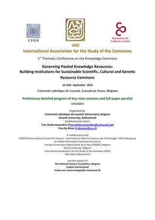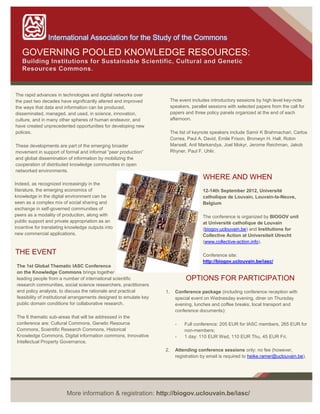 The document summarizes an upcoming conference on knowledge commons. It will bring together researchers from various fields to discuss institutional arrangements for collaborative scientific research. The conference includes keynote speakers and sessions on topics like open access publishing, constructing commons in intellectual resources, enabling access to research data internationally, and the historical experience of knowledge commons. The event will take place September 12-14, 2012 in Belgium, organized by universities and research organizations. It aims to address governing pooled knowledge resources and building sustainable commons for scientific, cultural and genetic resources.