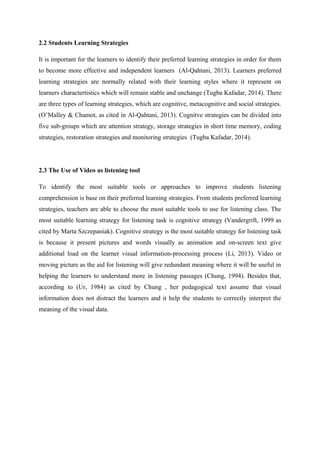 This chapter reviews literature on tools that can improve students' listening skills. It discusses theories of the listening process, which involves differentiating sounds, understanding vocabulary, grammar and meaning across three stages. The chapter also examines students' learning strategies, including cognitive, metacognitive and social strategies. Finally, it analyzes using video as a listening tool, finding that the visual elements in video can help interpretation and do not distract students, making video a suitable tool to support cognitive listening strategies.