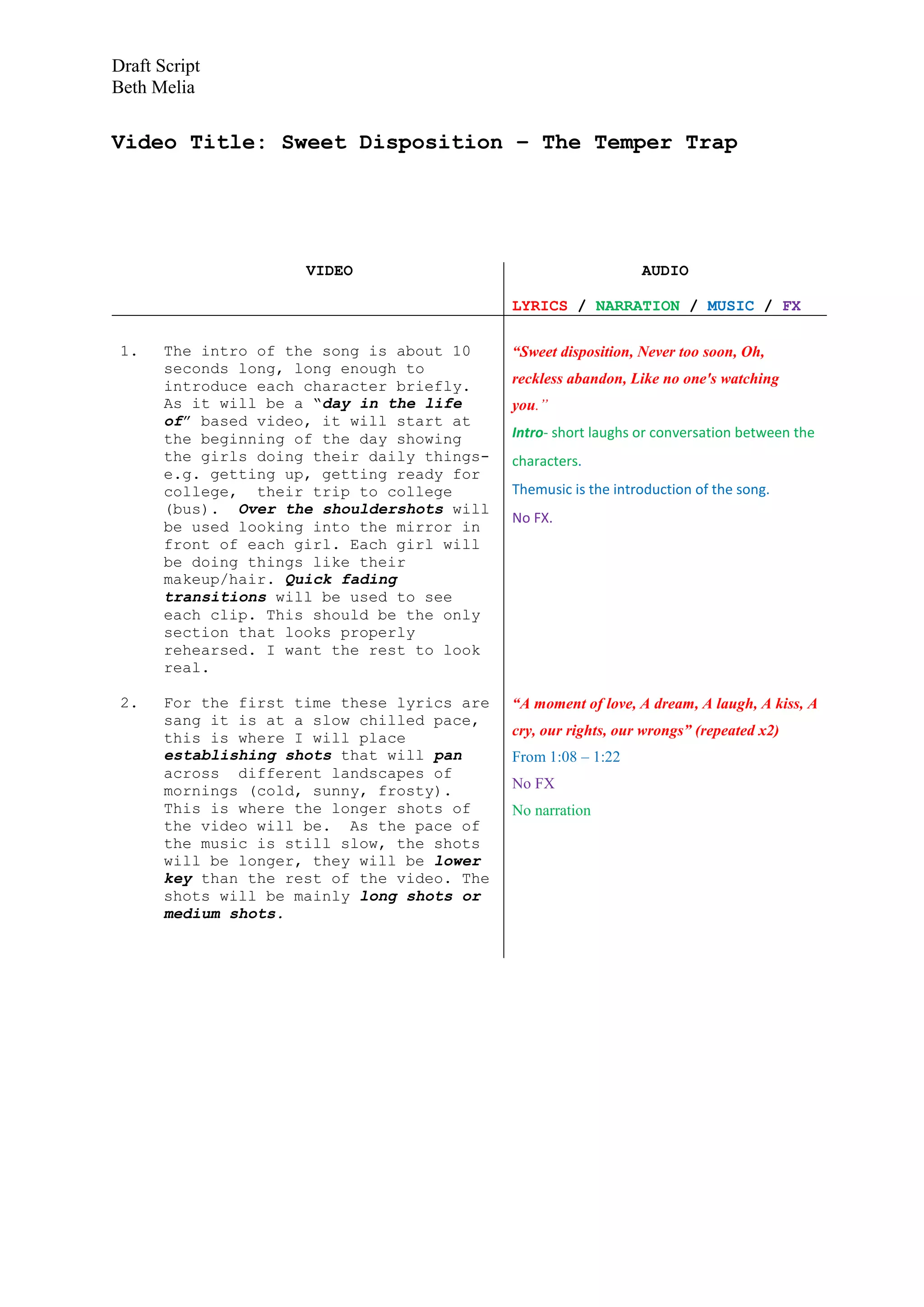 This 8-part script summarizes the scenes and shots planned for a music video set to the song "Sweet Disposition" by The Temper Trap. It will follow a group of girls through their morning routine, travels to college, a house party that night, and their hungover walk home the next morning. The video will use a mix of rehearsed and candid shots to capture the "day in the life" story, with lighting and camerawork coordinated to the pace and lyrics of the song. Key planned shots include character introductions getting ready, landscape establishing shots, a train window view, dancing at the party modeled after "Project X," and the girls walking away at sunrise as the song ends.