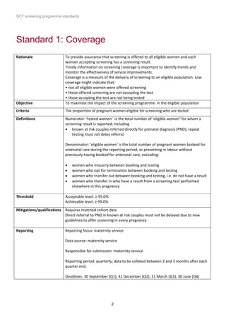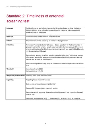 1) The document outlines standards for a sickle cell and thalassemia (SCT) screening program, including standards related to coverage, timeliness of screening tests, completion of questionnaires, turnaround times, counseling and offering of prenatal diagnosis, and timeliness of prenatal diagnosis.