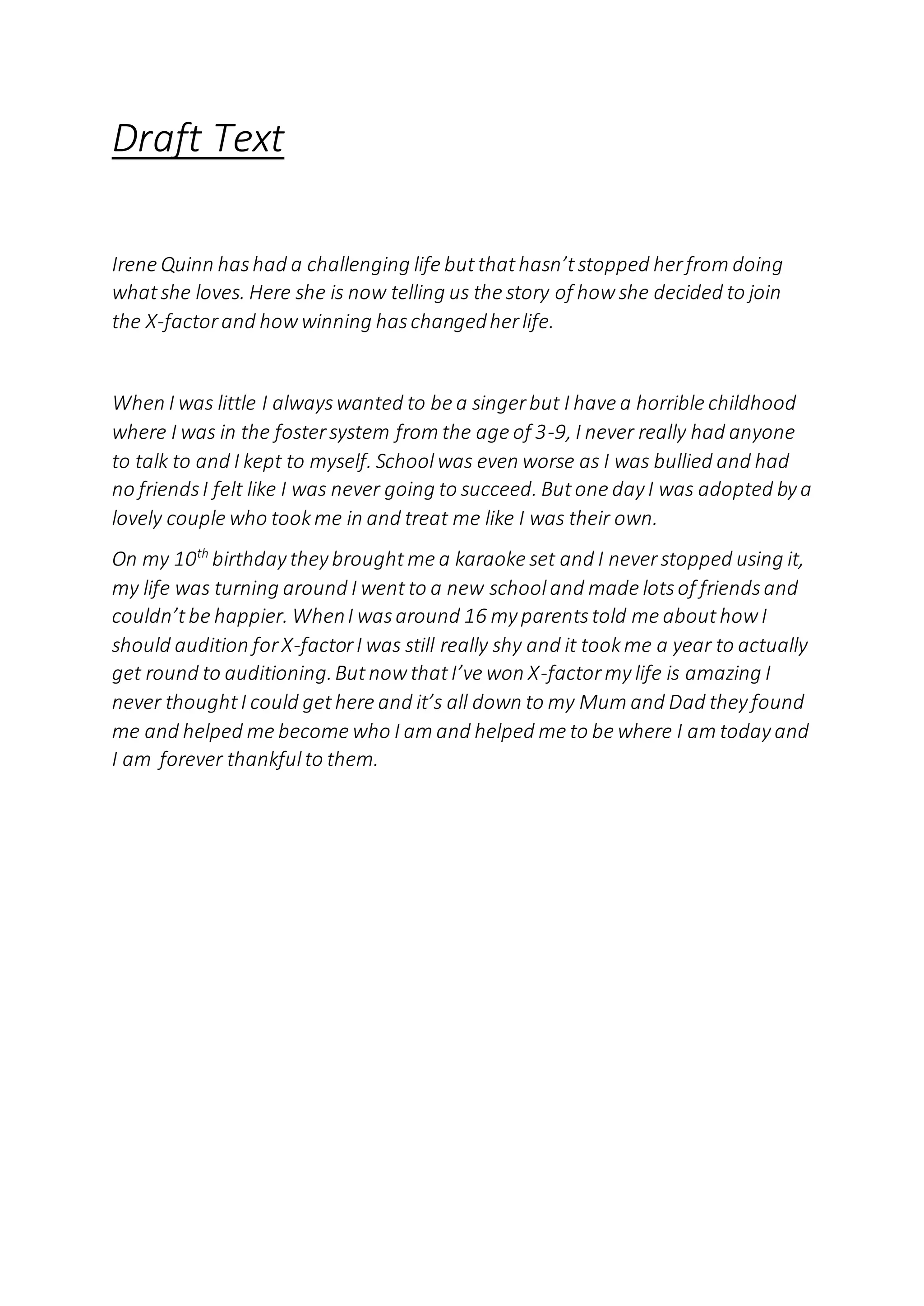 Irene Quinn had a difficult childhood being in foster care from ages 3 to 9 and being bullied in school, but was later adopted by a lovely couple who helped her pursue her dream of becoming a singer. She was shy but eventually auditioned for and won The X Factor at age 16, which changed her life and led to success she never thought possible thanks to the support of her adoptive parents who helped her become confident in herself.