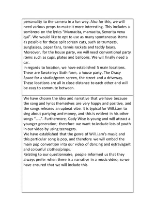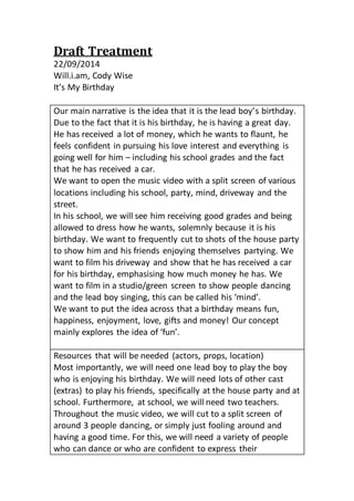 The document outlines a treatment for a music video for the song "It's My Birthday" by Will.i.am and Cody Wise. The main narrative is that it is the lead boy's birthday and he is having a great day due to receiving gifts of money, pursuing his love interest, good grades, and a new car. The treatment details locations, characters, and props needed which include scenes at school, a house party, studio/green screen, street, and driveway. The goal is to portray the ideas of fun, happiness, enjoyment, love, gifts and money on a birthday through dancing, clothing, and spontaneous props.