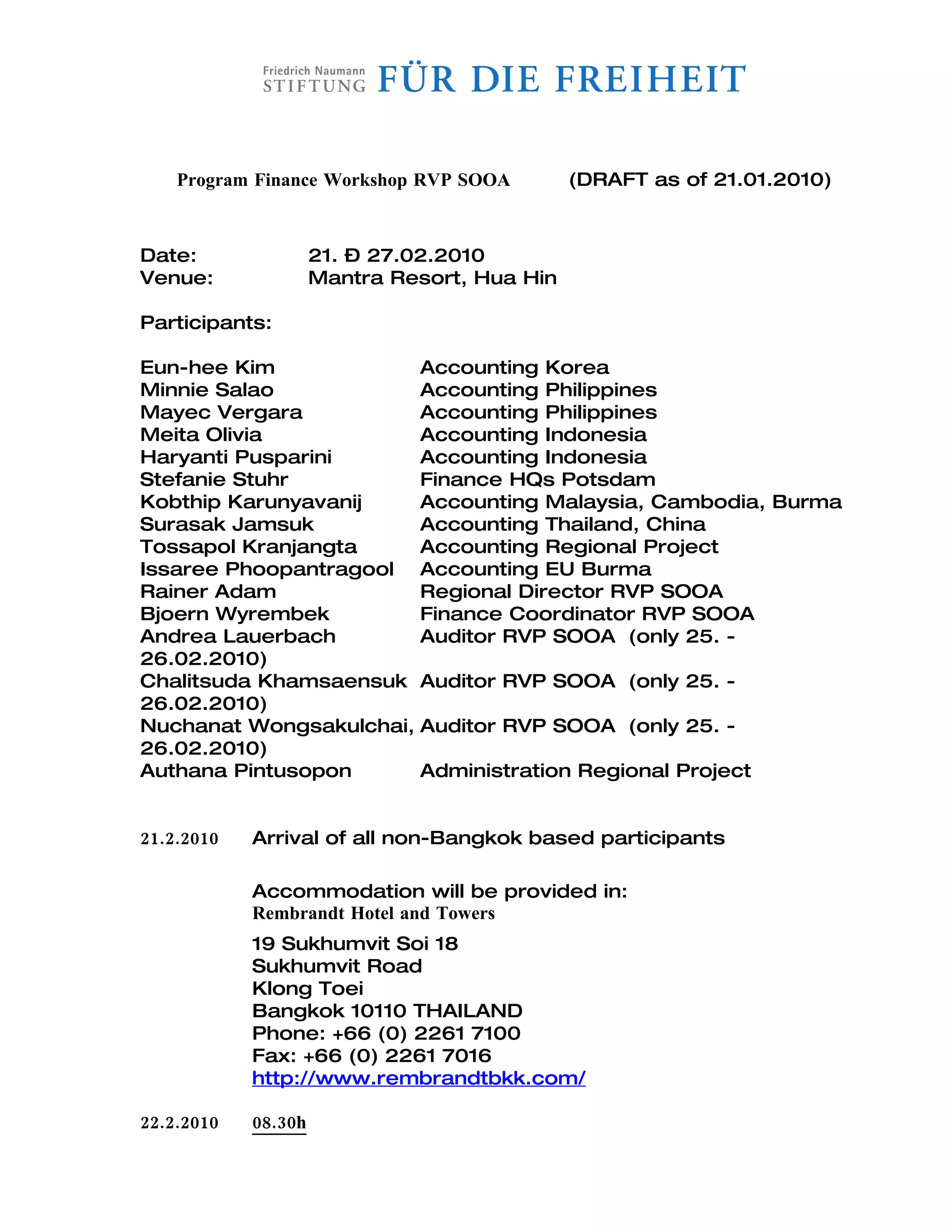 The document outlines an agenda for a Program Finance Workshop taking place from February 21-27, 2010 at the Mantra Resort in Hua Hin, Thailand. It lists participants from accounting departments in various countries. The workshop will cover topics like budget planning, liquidity planning, financial compliance, auditing, and general accounting questions. Participants will discuss budget planning tools, budget structure differences, liquidity requests, and handling audit reports and bookkeeping corrections. The agenda includes sessions, coffee breaks, meals, transportation, and accommodations.
