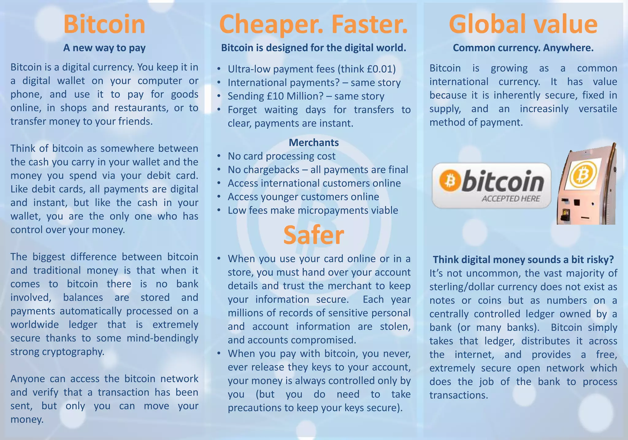 Bitcoin is a digital currency that allows users to pay for goods and services online or in person using a digital wallet on their phone or computer. Unlike traditional currencies controlled by banks, bitcoin transactions are processed and secured on a decentralized global ledger using strong cryptography. Bitcoin offers lower fees and faster international payments than traditional options. While it may seem risky, bitcoin provides stronger security than traditional online payments by keeping users' money under their sole control at all times.