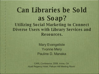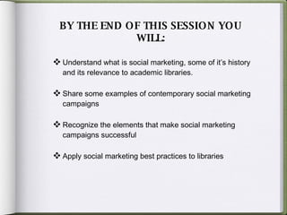 This document discusses using social marketing techniques to promote library services and resources to diverse users. It begins by defining social marketing and its focus on understanding user wants/needs. Examples of successful social marketing campaigns like "Click it or Ticket" and anti-smoking campaigns are provided. The document then outlines the key steps to developing an effective social marketing campaign: choosing a target audience, selecting a specific desired action, crafting a message that appeals to audience values and offers an immediate reward, and identifying optimal communication channels and times. Attendees are guided through applying these steps to develop a hypothetical library marketing campaign.
