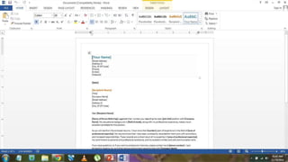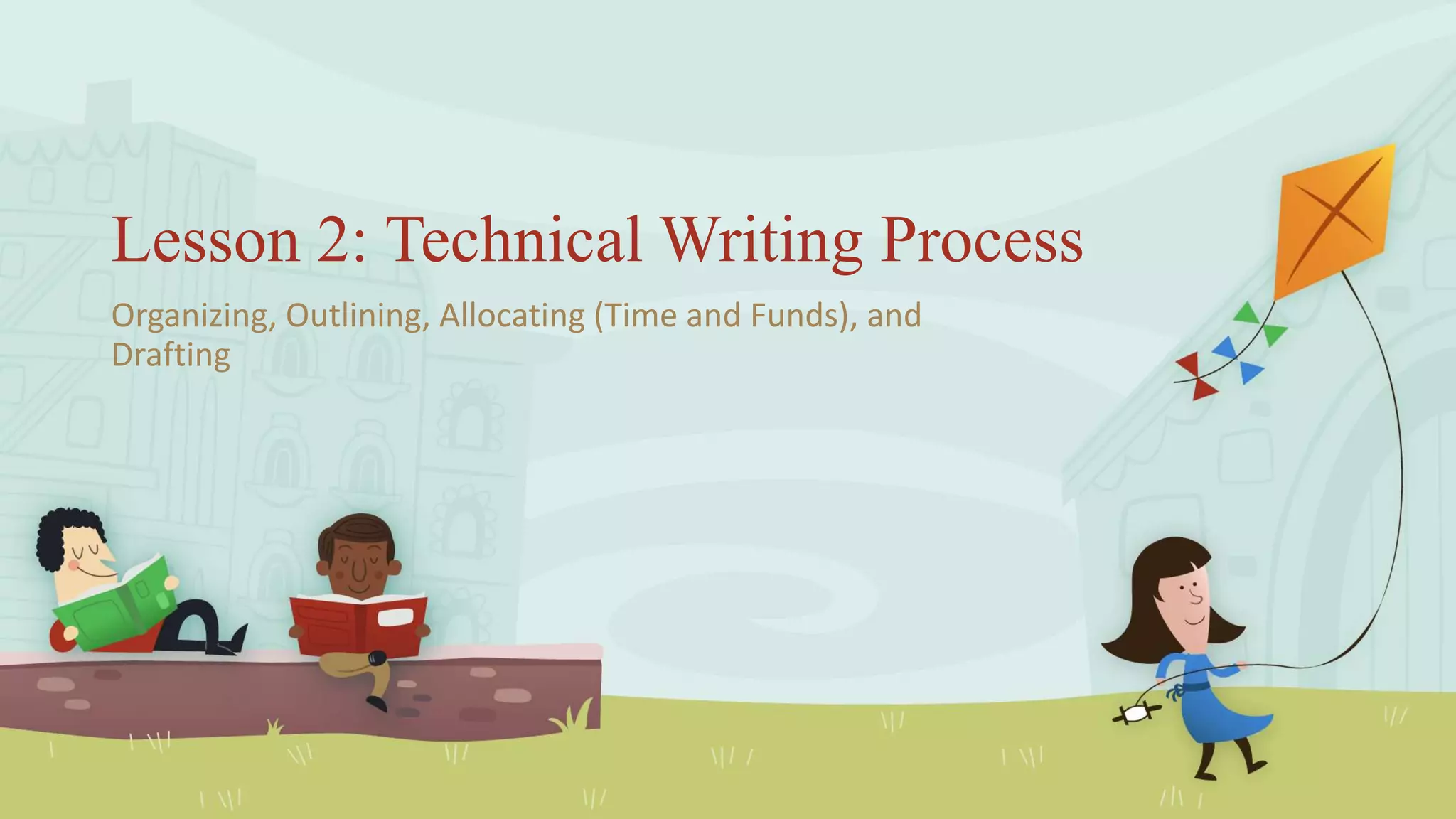 The document discusses the technical writing process, including organizing and outlining documents, allocating time and funds for projects, and drafting documents effectively. It provides definitions and examples of organizing, outlining, project proposals, and drafting. Guidelines are presented for using templates and styles in drafting as well as the advantages and disadvantages of using default templates and styles.