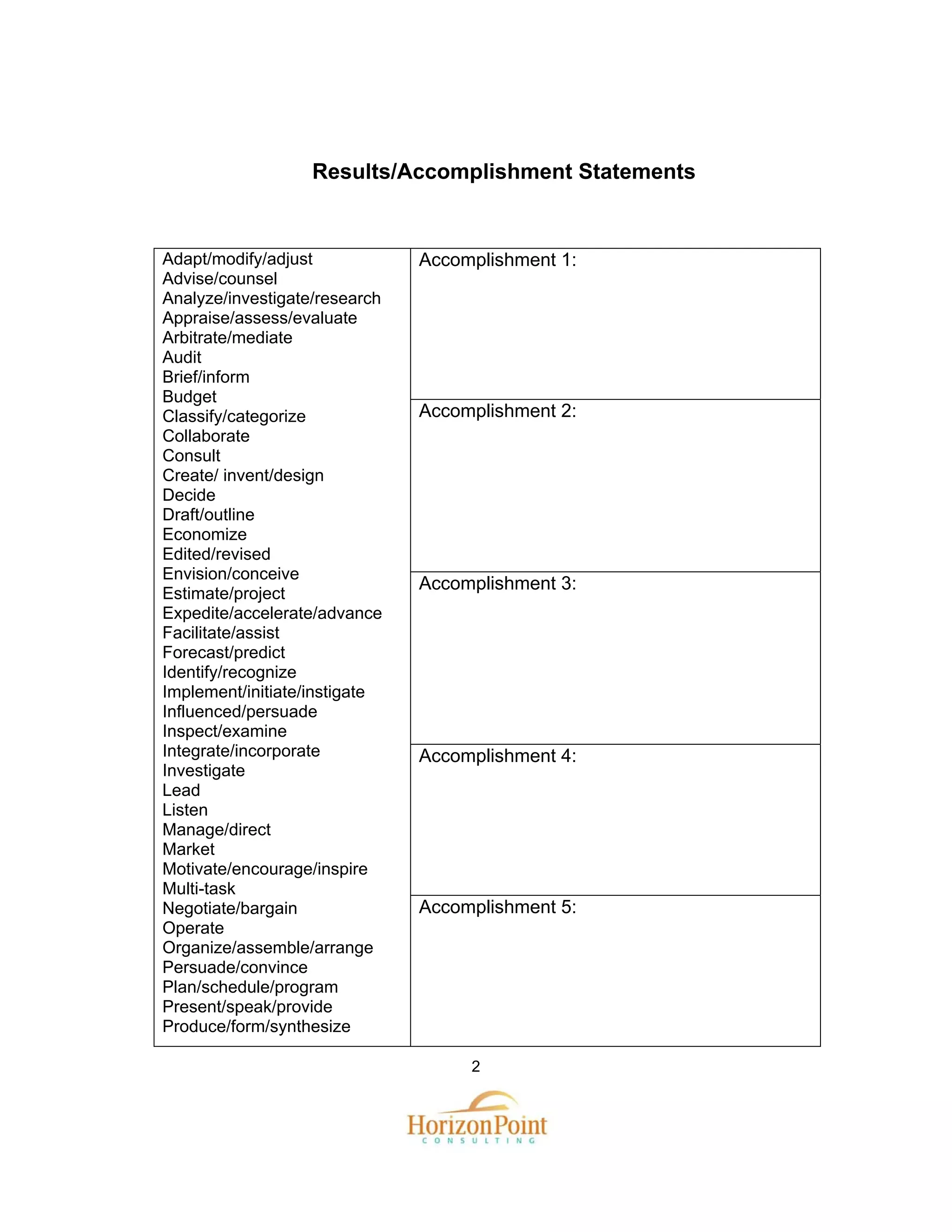 The document emphasizes the importance of recognizing and articulating personal and professional accomplishments that provide satisfaction and pride. It encourages individuals to detail these achievements, supported by quantifiable results and key skills developed, and guides them through the process of creating effective results statements. The document also highlights the value of initiative and improvement in achieving job goals and exceeding performance expectations.
