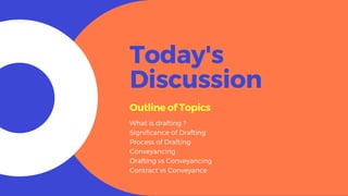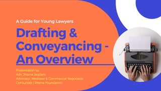 The document provides an overview of drafting and conveyancing for young lawyers. It defines drafting as preparing legal documents like agreements and contracts. The importance of understanding drafting is explained, noting the need to understand the nexus between law, facts, and language. Conveyancing is defined as drafting deeds to transfer rights and interests in property from one person to another. Key differences between drafting and conveyancing are conveyed, with conveyancing focusing more on property transfer documentation, and between contracts and conveyances, with contracts remaining to be performed while conveyances pass property title.