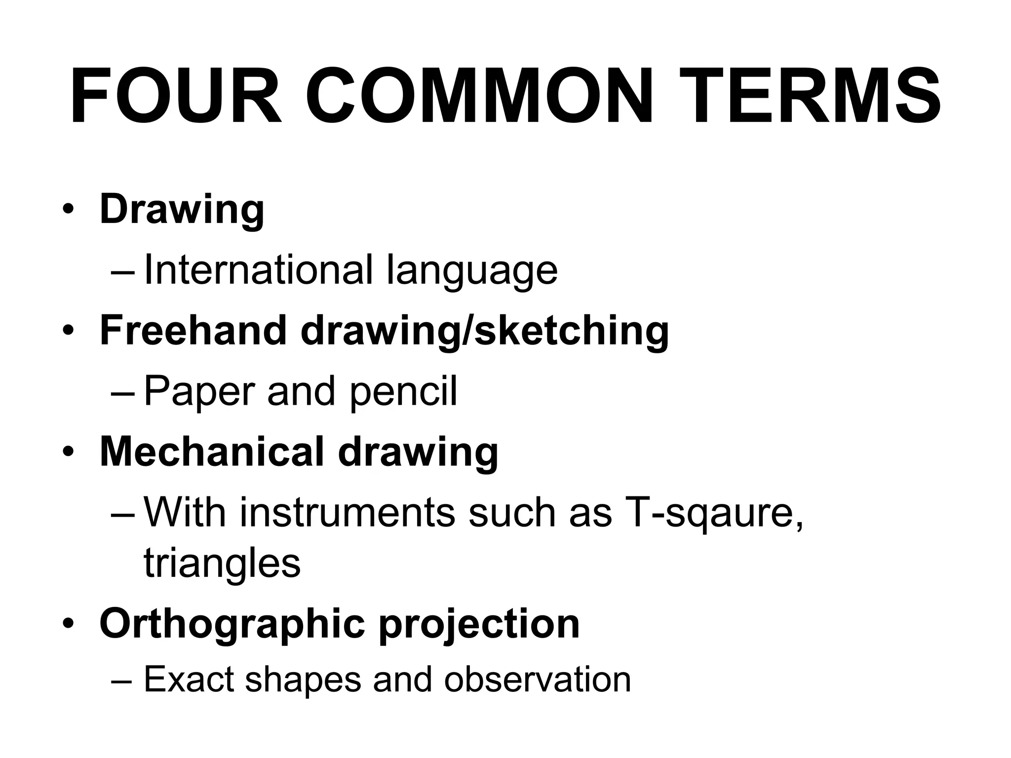 The document provides an overview of various drafting techniques and drawing types, including orthographic projection, isometric, and oblique drawing methods. It outlines necessary tools, pencil grades, and dimensions crucial for effective drafting, as well as classifications of polygons, triangles, and types of graphs and charts used in representation. Additionally, it discusses standards for lettering, line types, and essential guidelines for creating accurate and visually appealing drawings.