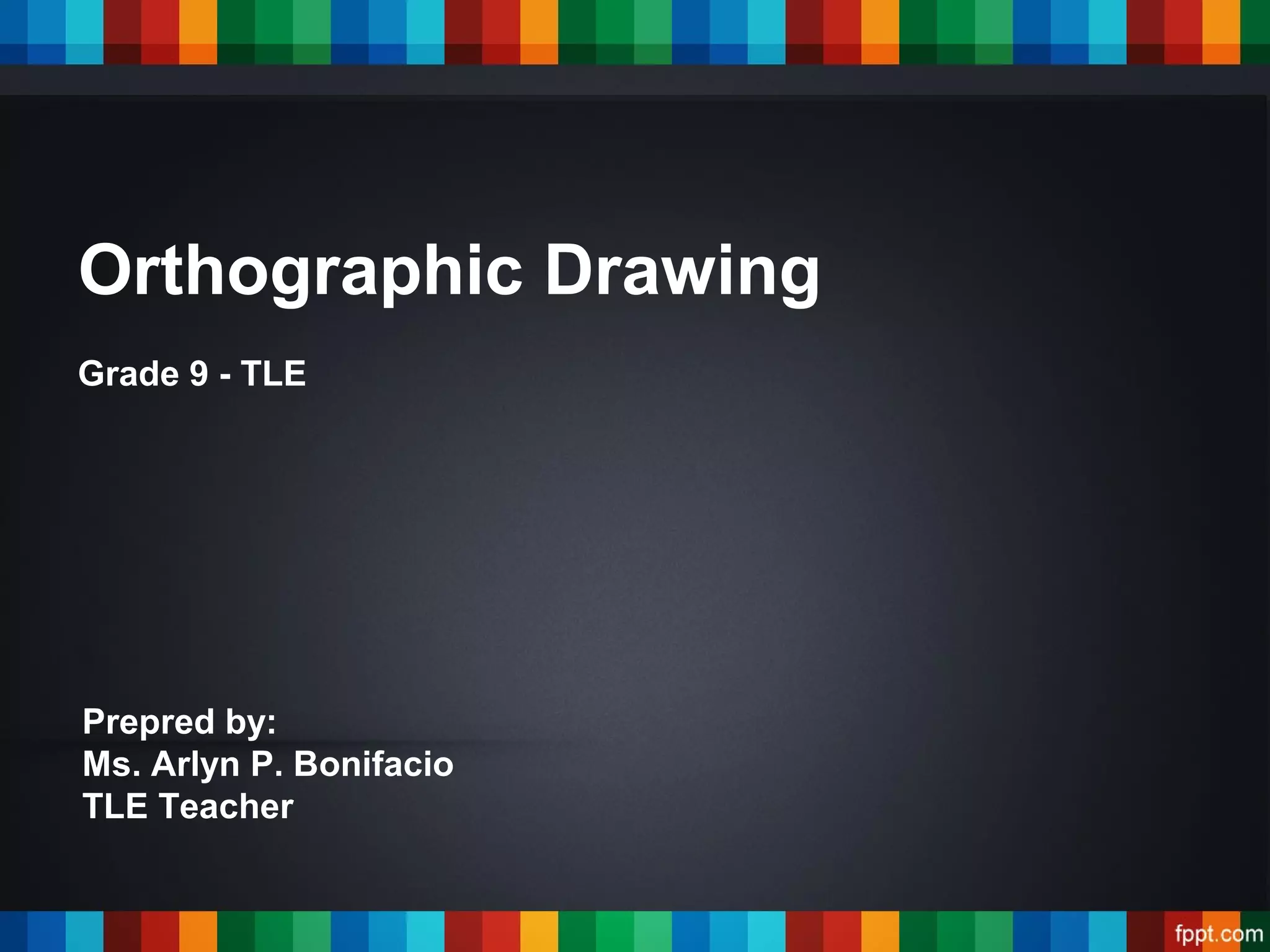 This document defines orthographic drawing and its importance in technical and engineering fields. It explains that orthographic drawing uses multiple views to represent the exact shape and size of an object through lines without shading. It then details the "alphabet of lines" which establishes the different line types used in technical drawings, such as visible, hidden, center, dimension, and leader lines, and defines the purpose of each line type. The document aims to teach the fundamentals and principles of orthographic drawing.