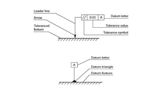This document provides information on drafting symbols used for machining and geometric tolerances. It defines symbols for surface roughness, machining method, sampling length, direction of lay, and machining allowances. It also includes symbols used to represent threads, thread form, and whether a thread is right-handed or left-handed.