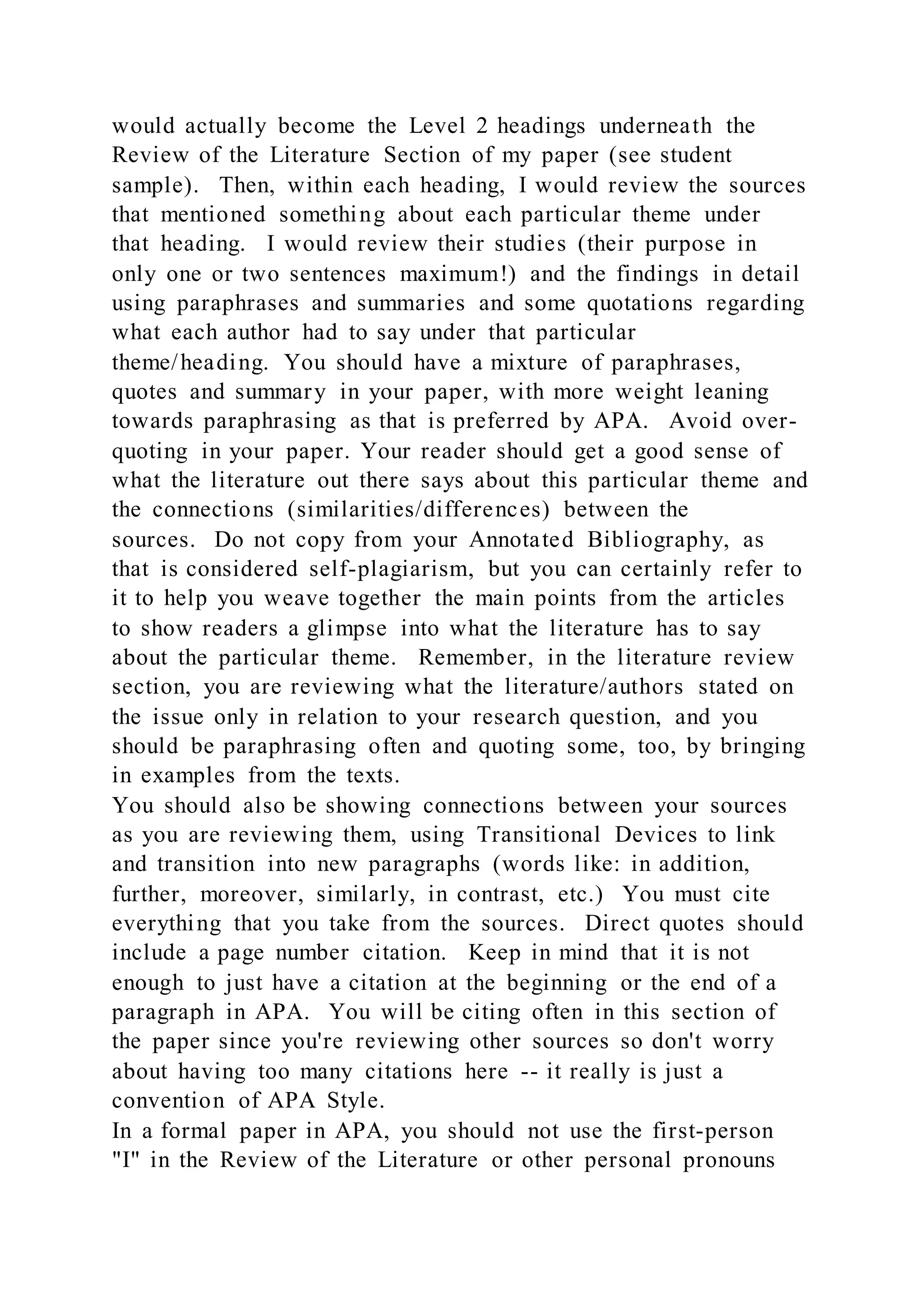 The document provides essential guidelines for writing a literature review, emphasizing the importance of organizing it by two selected themes based on the research question. Each theme should include detailed reviews of three sources, showcasing connections, similarities, and differences in findings while adhering to APA style. It also discusses the structure of the paper, including the introduction, methods, discussion, and conclusion, along with citation and paraphrasing requirements to avoid plagiarism.
