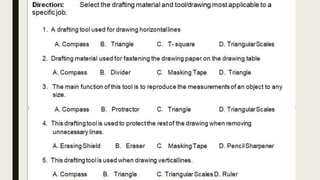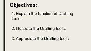 This document provides an overview of mechanical drafting tools and materials. It begins by listing objectives to explain drafting tool functions, illustrate tools, and appreciate their use. It then defines key drafting terms. The main body describes common drafting materials like paper, tape, pencil sharpeners, erasers, and pencils in various grades. It also details important drawing instruments such as T-squares, triangles, compasses, dividers, and protractors. It concludes by announcing a quiz and homework assignment requiring students to bring specific drafting supplies to the next class.