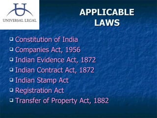 The document discusses the art and craft of drafting legal documents in India. It provides an overview of key concepts like what constitutes a deed, different types of deeds, and parts of a deed. It outlines principles of good drafting like using clear, concise language and logical structure. It also describes important elements to include in a deed like parties, recitals, operative clauses, descriptions of property, covenants, execution, and attestation. Sample clauses for different types of deeds are also provided.