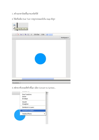 Oval Tool วาดรูปวงกลมลงไปใน stage ดังรูป 3. คลิกขวาที่วงกลมที่สร้างขึ้นมา เลือก Convert to Symbol...