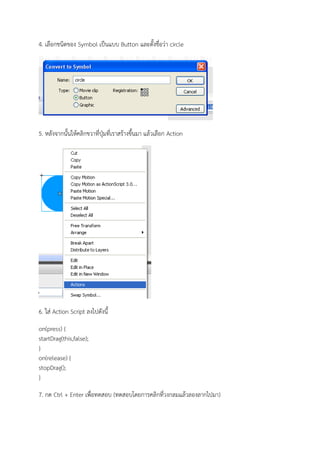 เป็นแบบ Button และตั้งชื่อว่า circle 5. หลังจากนั้นให้คลิกขวาที่ปุ่มที่เราสร้างขึ้นมา แล้วเลือก Action 6. ใส่ Action Script ลงไปดังนี้ on(press) { startDrag(this,false); } on(release) { stopDrag(); } 7. กด Ctrl + Enter เพื่อทดสอบ (ทดสอบโดยการคลิกที่วงกลมแล้วลองลากไปมา)