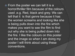 This document summarizes a trailer and movie poster for a horror/thriller film. The trailer uses various shot types and transitions to build tension through a storyline where a woman's decision to deny an old woman's request leads to a curse being placed on her. Strange things then start happening to the woman. The poster depicts the main character screaming as she appears to be pulled down towards fire, drawing the viewer in to find out more. Both the trailer and poster utilize common horror conventions to intrigue viewers and set the tone for the genre.