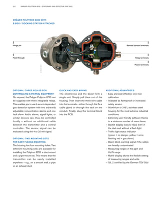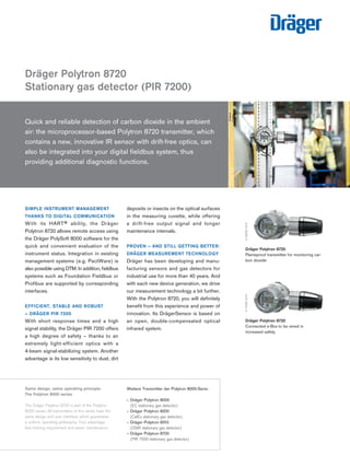 The Dräger Polytron 8720 stationary gas detector allows remote access and integration into management systems using digital communication standards like HART. It features an infrared optical sensor with a 4-beam stabilizing system for stable, robust measurements of gases like carbon dioxide. As part of the Polytron 8000 series, it has a consistent design and user interface across models. Accessories like mounting kits, filters, and calibration adapters allow flexible installation and maintenance.