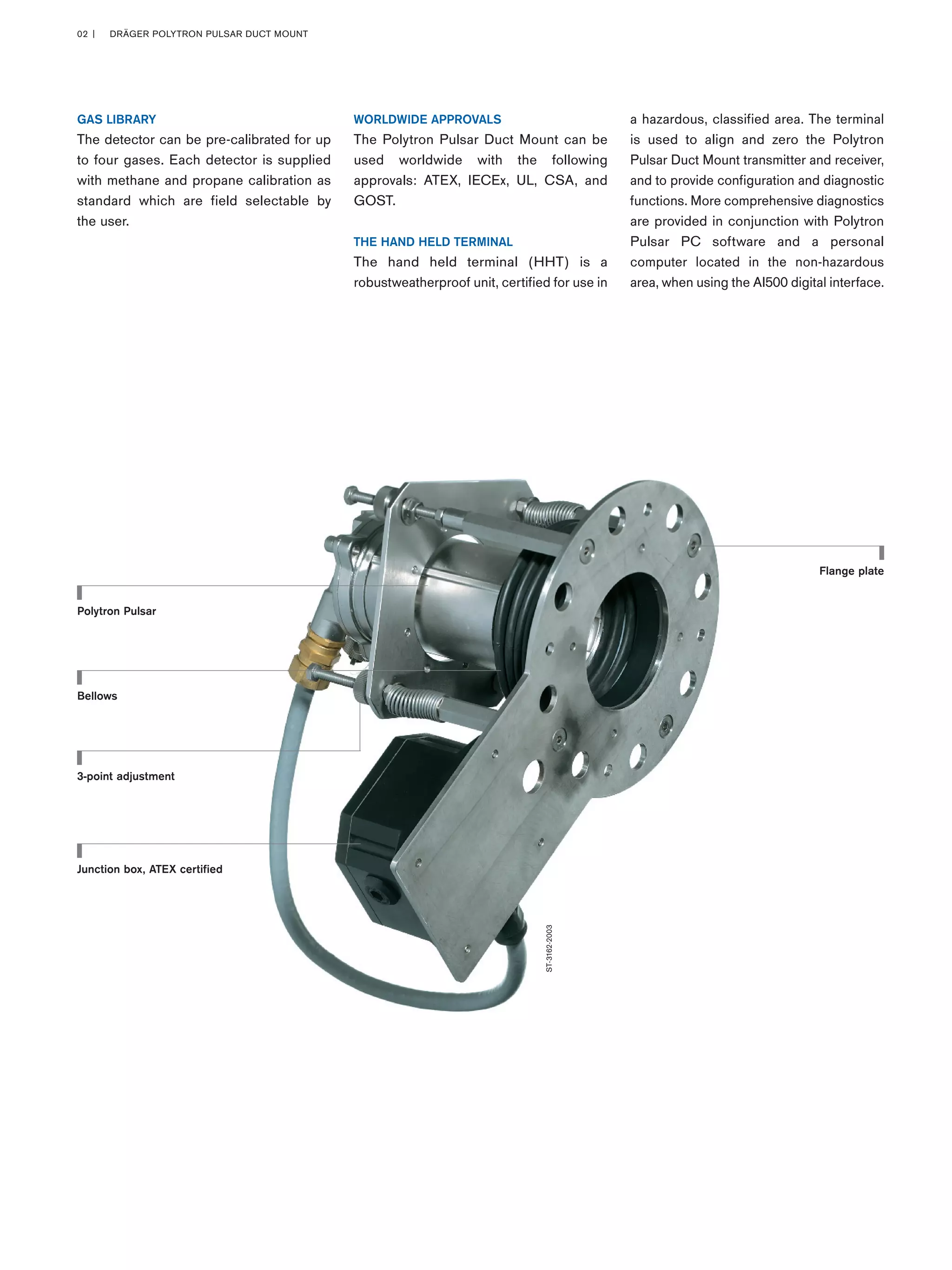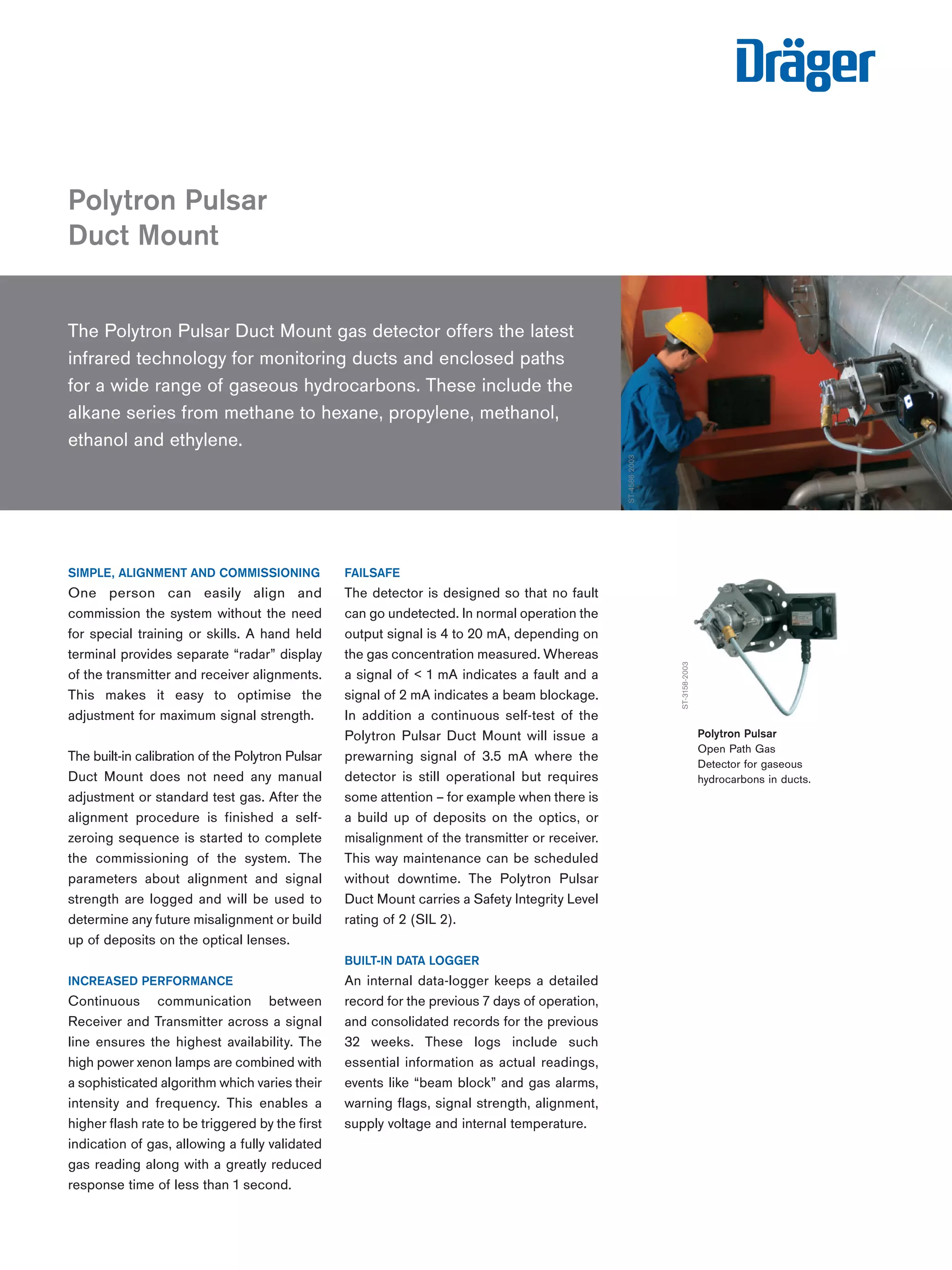The Polytron Pulsar Duct Mount gas detector uses infrared technology to monitor ducts for a variety of gases. It can be easily aligned and commissioned by one person without training. It provides continuous monitoring, early detection of gases, and failsafe operation with internal diagnostics and data logging.