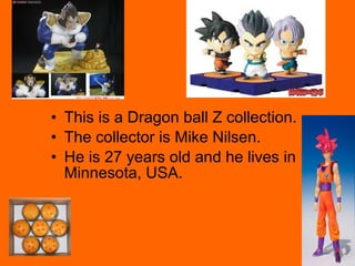 This document describes a Dragon Ball Z collection owned by Mike Nilsen, a 27-year-old man from Minnesota, USA who has amassed over 5,000 pieces since starting his collection in 1996.