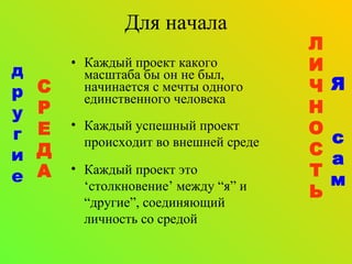 Документ описывает подход 'dragon dreaming' к созданию успешных проектов, основываясь на взаимодействии личности и окружающей среды. Каждый проект начинается с мечты и включает множество вкладов и результатов, где личность и окружение обмениваются ресурсами для достижения общих целей. Успех проекта зависит от способности интегрировать теорию и практику, а также адаптироваться к изменениям в процессе.