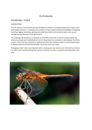 The document outlines a pre-production plan for a final year project in Computer Generated Imagery at Southampton Solent University, focusing on creating a short film featuring a dragonfly and its environment. The author intends to gain a comprehensive understanding of various skills related to modelling, texturing, rigging, animating, lighting, and rendering, while analyzing potential job opportunities in film and advertising sectors. The project involves collaborating with a partner to produce a visually stunning and technically sound animated scene, highlighting the importance of teamwork and skill development in the CGI industry.