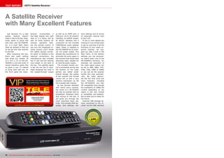 The document provides a review of the Dragonsat DS-5500HD satellite receiver. It has many excellent features for its small size, including a fully integrated internet connection. The receiver has a user-friendly menu system, supports multiple recording functions simultaneously, and also functions as a multimedia player with access to online content and files on networked devices. Overall, the review finds the DS-5500HD to be a very fast satellite receiver with a strong orientation toward internet content reception.