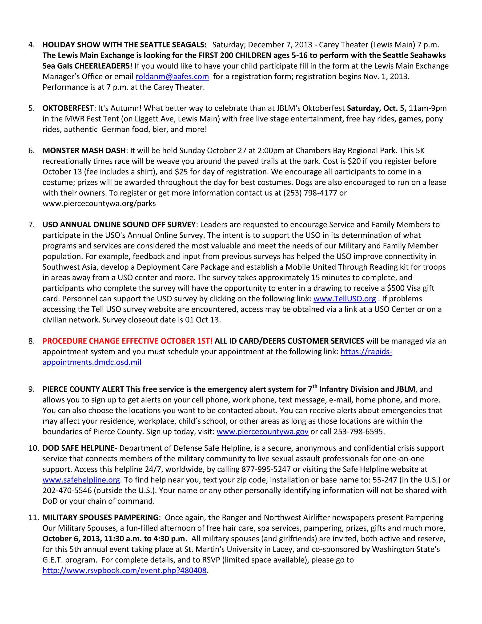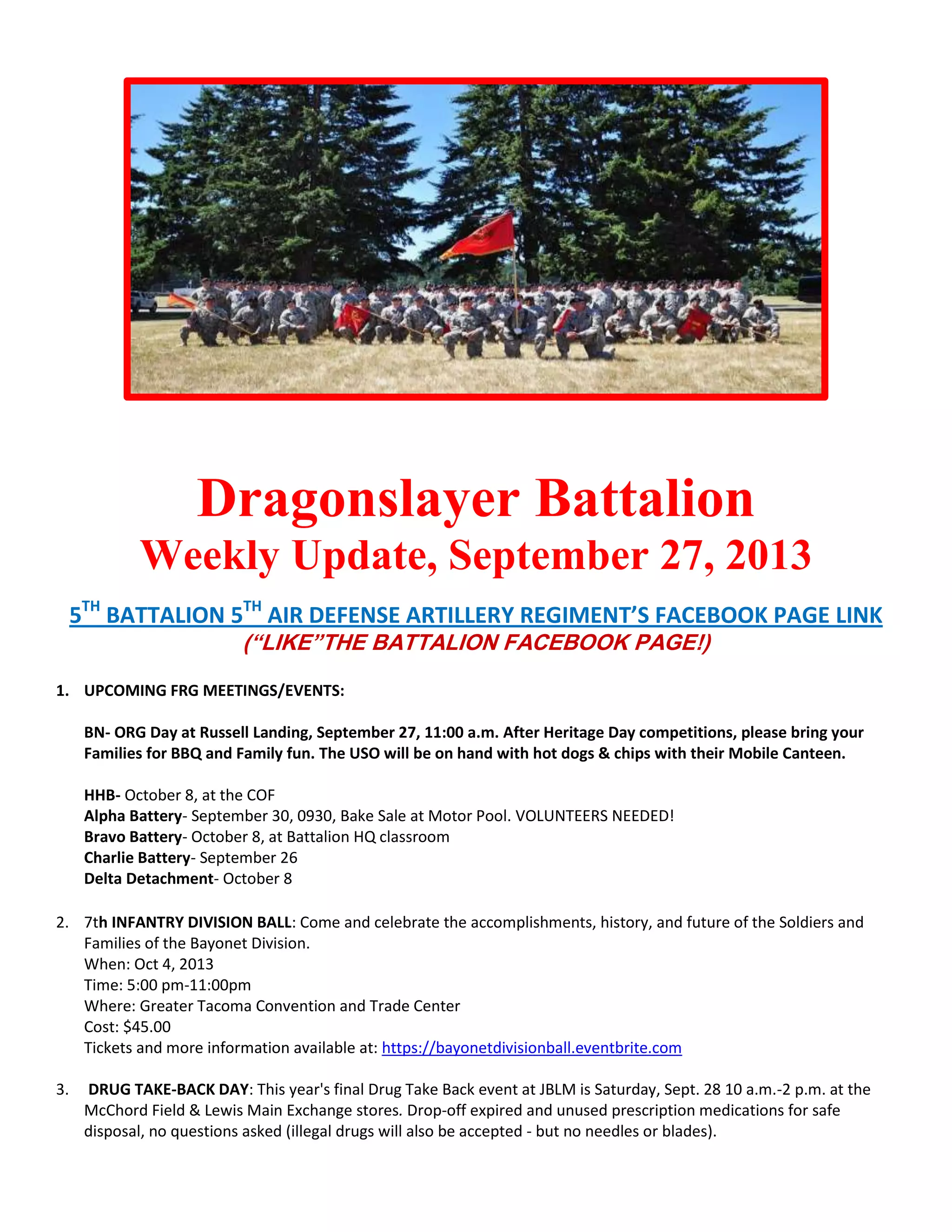 The Dragonslayer Battalion weekly update for September 27, 2013 highlights upcoming events including a BBQ on Sep 27, a drug take-back day on Sep 28, and the 7th Infantry Division Ball on Oct 4. Additional activities include the Oktoberfest celebration on Oct 5, a military spouses pampering event on Oct 6, and a Monster Mash Dash on Oct 27. The update also covers various resources for military families, including a support helpline and a request for participation in a USO survey to improve services.