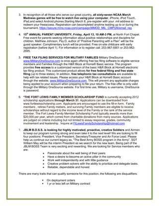The document provides information on various upcoming events at Joint Base Lewis-McChord including unit meetings, runs, tax assistance resources, scholarships, and other community activities occurring in March and April. Key events include a St. Patrick's Day 5K/10K run on March 17th, the annual Parent University seminar on April 13th, and wearing purple on April 13th to support military children during the Month of the Military Child.
