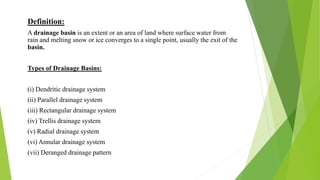 A drainage basin is an area of land where surface water converges to a single point, usually the exit of the basin. There are several types of drainage systems that form depending on the terrain and geology, including dendritic, parallel, rectangular, trellis, radial, and annular systems. Stream ordering schemes classify streams in a hierarchy based on how they join together. Quantitative analysis of drainage basins uses metrics like bifurcation ratio, length ratio, and drainage density to characterize aspects of the basin.