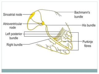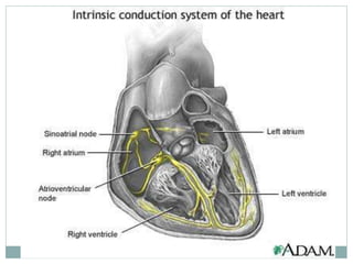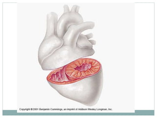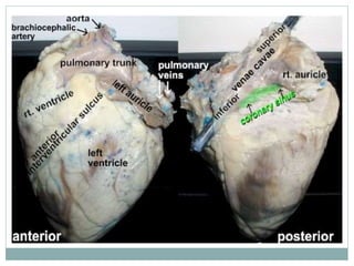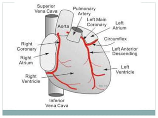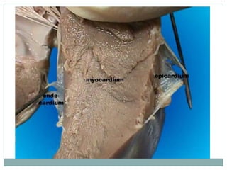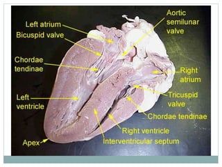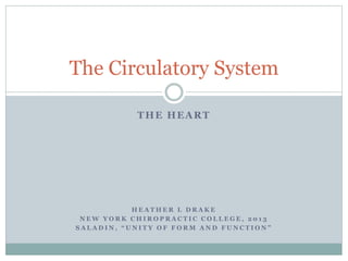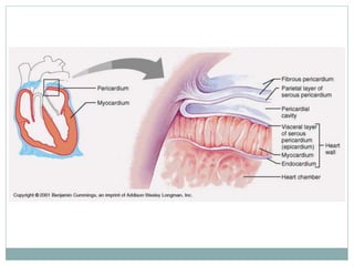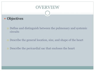 The document provides an overview of the heart and circulatory system. It describes the pulmonary and systemic circuits, with the pulmonary circuit carrying deoxygenated blood to the lungs and returning it oxygenated to the left side of the heart. The systemic circuit then supplies oxygenated blood to the entire body from the left side of the heart. It details the flow of blood through the heart chambers, with the right side receiving deoxygenated blood and pumping it to the lungs, and the left side receiving oxygenated blood and pumping it out to the body. The heart is enclosed within the pericardial sac and has three layers: epicardium, myocardium, and endocardium.