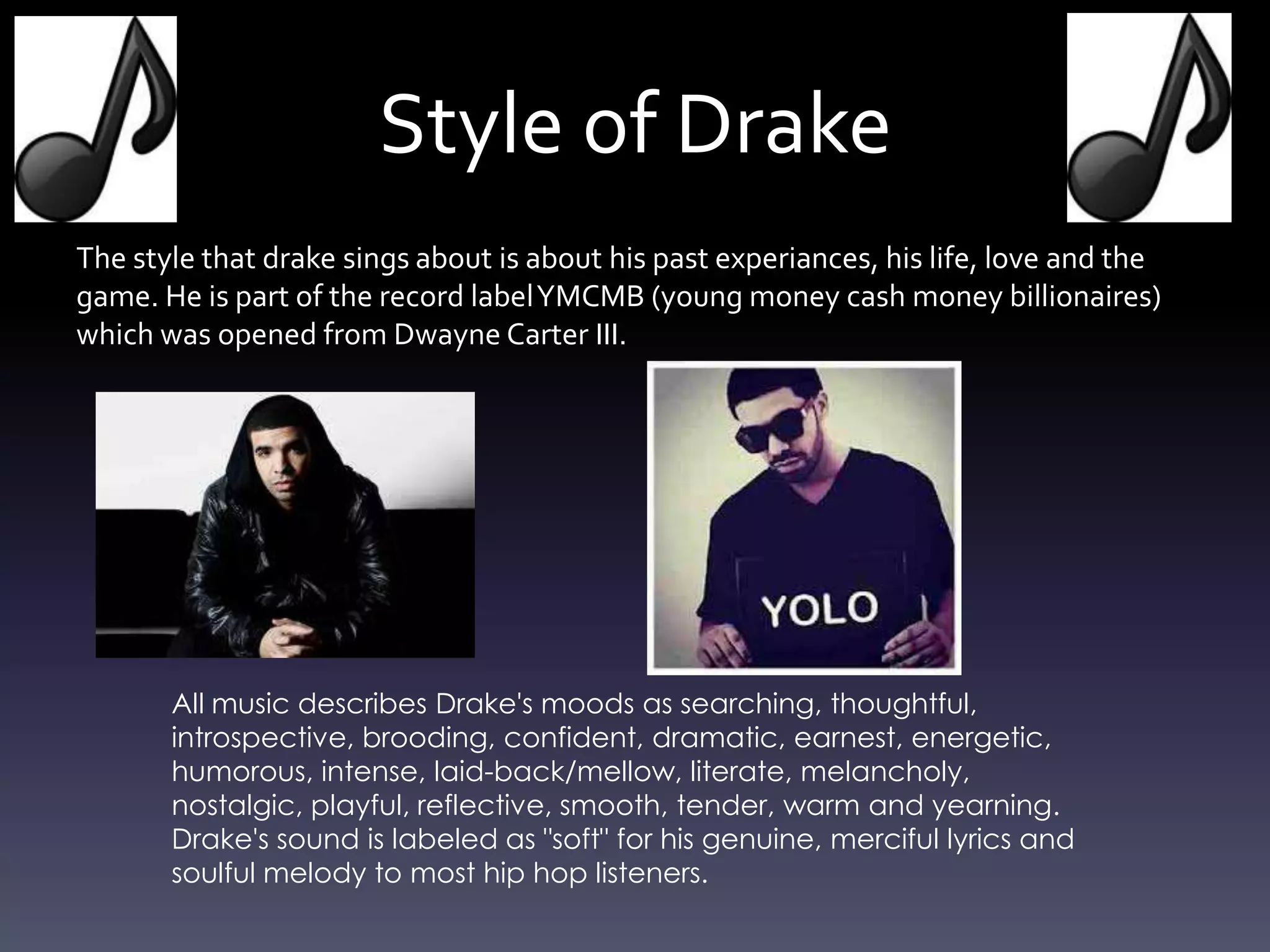 Drake's style focuses on his life experiences, love, and music industry. He sings about introspective and emotional topics. His sound is described as "soft" with soulful melodies. Drake started his career as an actor on Degrassi before pursuing rap music. He released several mixtapes and then his debut album Thank Me Later through Young Money Entertainment. Drake's target audience is typically teenagers and young adults who enjoy hip hop, rap, and R&B.