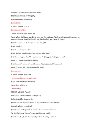 Yama, the God of Death, tells the story of Shah Jahan and Mumtaz Mahal to demonstrate the concepts of love and karma in Hinduism. Shah Jahan falls in love with Mumtaz at first sight and marries her after gaining his father's approval. Mumtaz gives birth to 14 children but dies during childbirth. Grieving, Shah Jahan builds the Taj Mahal over 22 years as a monument to her. The story also depicts the harsh life of slaves and how one kind slave is reincarnated into a better life while his cruel owner is reincarnated as a pig.