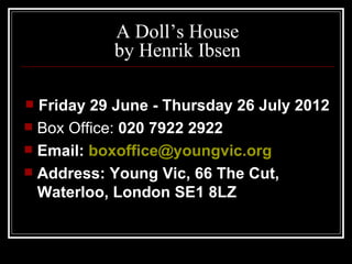 This document provides information about a production of A Doll's House by Henrik Ibsen playing at the Young Vic theater in London from June 29th to July 26th, 2012. It features Hattie Morahan and Dominic Rowan in the leading roles. The synopsis explains that the play depicts the moment when Nora discovers that her life and marriage are built on lies. The production is directed by Carrie Cracknell and features set design by Ian MacNeil. Students are assigned summer tasks of buying the Methuen Student Edition of the script, attending the production, and creating a presentation on Ibsen and the historical context of the play.