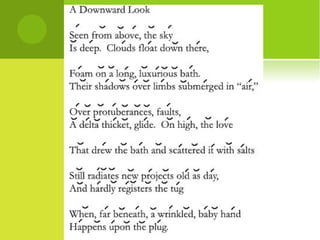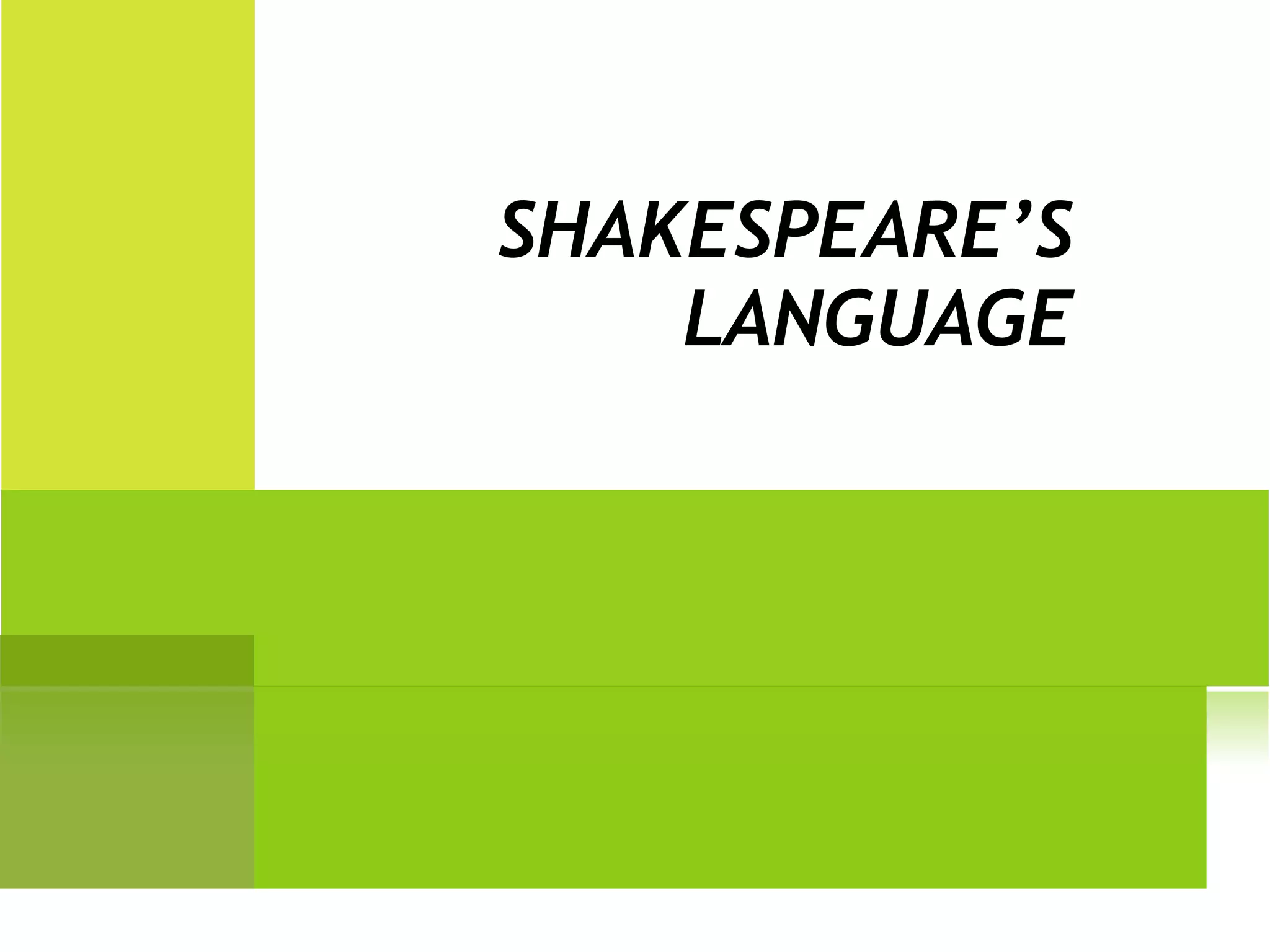 This document provides information about Shakespeare's use of meter, feet, and other poetic devices. It defines meter as the basic rhythmic structure of a poetic line containing a pattern of stressed and unstressed syllables. It describes the six main types of feet - iambic, anapestic, trochaic, dactylic, spondaic, and pyrrhic - used to form lines of varying lengths from one to seven feet. It gives an example of iambic pentameter, the meter used in Shakespeare's blank verse.