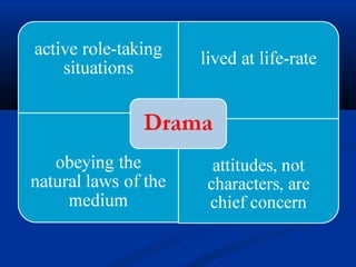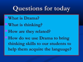 The document discusses the relationship between drama and thinking in education, emphasizing how drama can enhance students' thinking skills and language acquisition. It outlines various types of thinking and how drama serves as a tool for exploration, critical reflection, and problem-solving through activities like improvisation and conscience alley. Additionally, it highlights the importance of drama in creating a safe forum for students to express and engage with complex ideas and emotions.