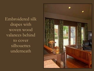 1) Rod pockets on short rods, embroidered silk drapes with woven wood valances, and inverted pleats with woven woods to cover silhouettes underneath windows.