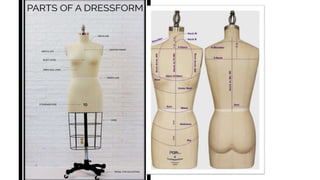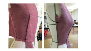 This document provides information about the draping process in fashion design. It defines draping as positioning and pinning fabric onto a dress form to develop the structure of a garment. Draping allows designers to sculpt one-of-a-kind designs through direct manipulation of the fabric. It is commonly used for couture and high-end pieces. The document also outlines various draping techniques, terms, tools used, and the steps involved in draping.