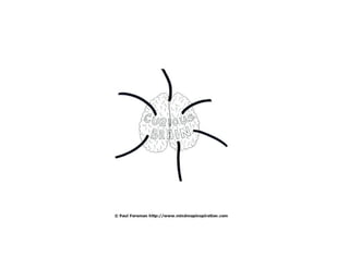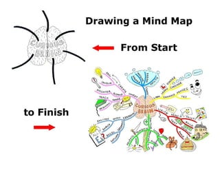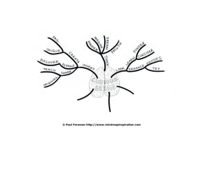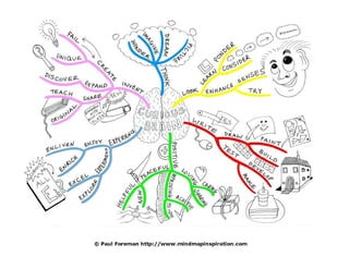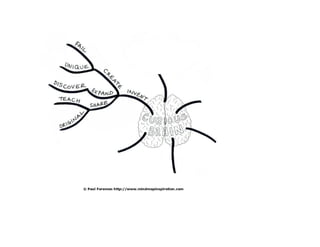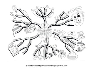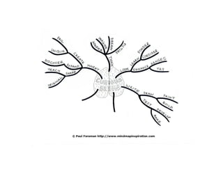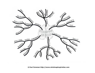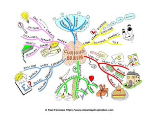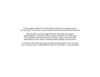The document explores the concept of a 'curious brain' through mind mapping, emphasizing the use of keywords and radial thinking to uncover diverse ideas. It outlines basic mind mapping rules inspired by Tony Buzan, such as starting in the center, using colors, and connecting branches organically. Additionally, it highlights the benefits of combining words and images for effective information retention and learning.