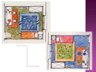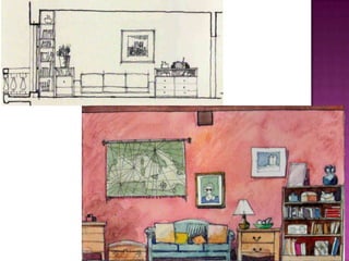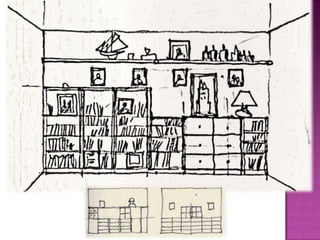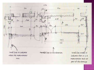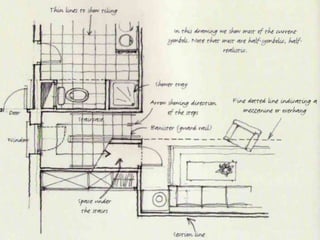 This document discusses symbols used in interior design drawings. Doors and windows are represented by simple symbols to indicate features like if they open inward or outward. Line thickness in drawings represents different elements, with base lines showing edges and thin lines showing non-structural details. Section lines distinguish walls from elements above in a plan view. Stairs are shown with banisters as two lines and an arrow to indicate direction. Elevations provide straight-on views of walls. Measurements are taken on site and translated to preliminary drawings before finalizing plans and elevations.