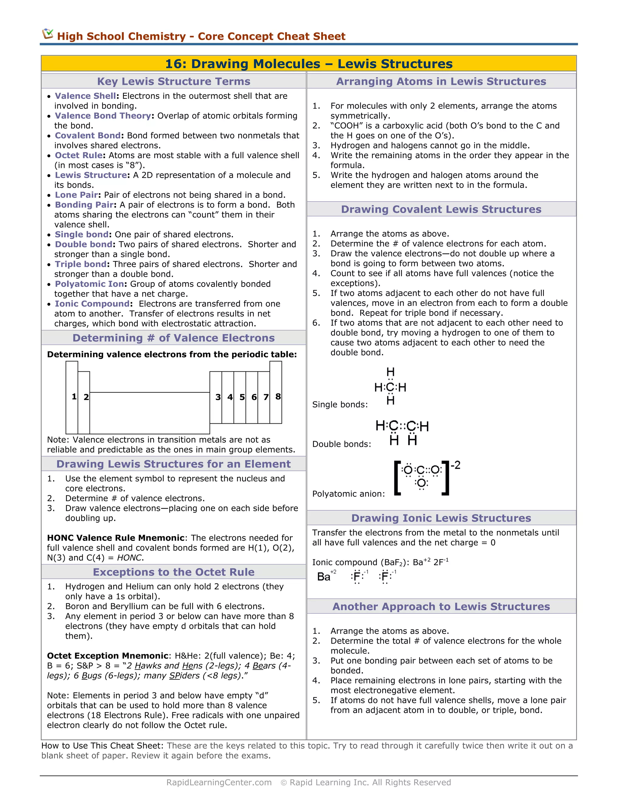 This document provides a summary of key concepts and steps for drawing Lewis structures of molecules and ions. It defines important terms like valence electrons, octet rule, and bonding vs. lone pairs. It outlines a 6-step process for drawing Lewis structures, including determining the number of valence electrons and arranging atoms to achieve full valence shells. Exceptions to the octet rule are noted for small atoms and those in period 3 or below. Mnemonics are provided to help remember electron configurations.