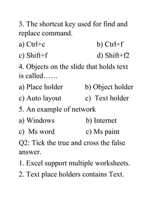 This document contains a student's final term paper for Computer class. The paper consists of multiple choice questions testing knowledge of worksheets, the internet, and Microsoft Office applications. It also includes true/false questions and short answer questions about hiding worksheets, shortcut keys, definitions of the internet, web browsers, and word art. The student answered questions in detail about connecting to the internet and changing default column widths in a worksheet.