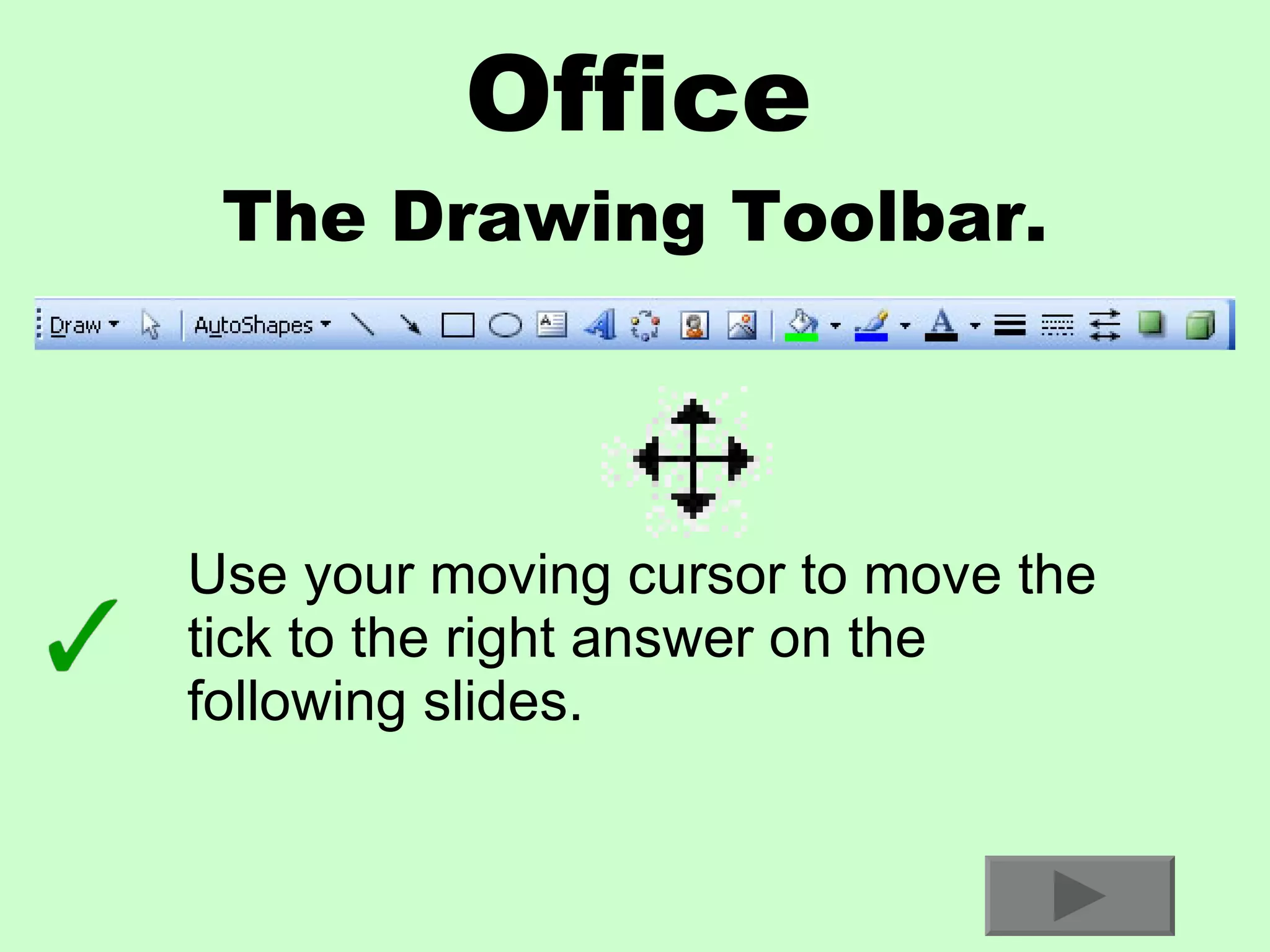 The document is a quiz about the functions of buttons on the Drawing Toolbar in Office. It contains multiple choice questions about which button is used to perform certain drawing tasks like drawing lines, arrows, boxes and circles. It also asks about buttons for inserting shapes and text boxes, changing colors, and adjusting line properties. The quiz provides feedback at the end that the user is finished.