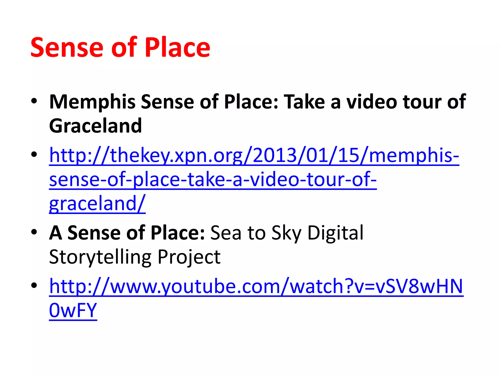 The document explores the concept of 'sense of place' through various video tours and projects that highlight specific locations like Graceland and Tucson. It poses reflective questions regarding attributes that define a place, such as ambiance, activities, and sensory experiences related to different environments like cafes, parks, and places of worship. Ultimately, it emphasizes the unique characteristics and personal connections that make a location significant to individuals.