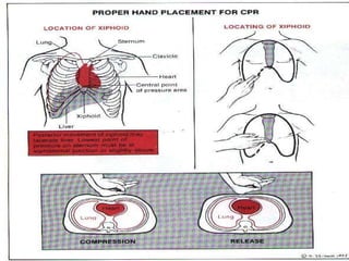 KARDİO PULMONER RESUSİTASTONC – Dolaşım: Değerlendirme; Nabız karotis arterden hissedilmeye çalışılır (5sn). Nabız varsa dakikada 12 solunum yaptırılır Her 5saniyede bir solunum. Eğer nabız yok ise external kalp masajına başlanır. Masaj yapılacak yer saptanır. Göğüs kafesinin alt sınırında sternumun alt ucuna doğru iki parmak ile kisifoid çıkıntı tespit edilir. Kisifoid çıkıntının iki parmak üstüne eller kenetlenerek konulur.