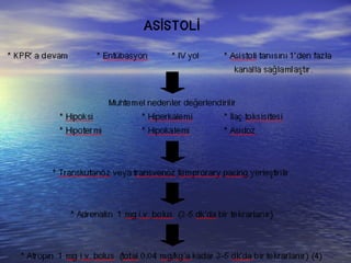 İLAÇ TEDAVİLERİ KALSİYUMANTAGONİSTLERİ :-Koroner kan akımını arttırır.-Oksijen tüketimini azaltır.-AV iletimi etkiler.-Refraktör periyodu uzatır.-Supraventriküler taşikardileri düzeltir.-Ventriküler disritmileri tedavi etmezler.-iİletim bloklarında ve digital toksikasyonlarında uygulanmaları tehlikelidir. FURASEMİD :Henle kulbunun proksimal ve distal tüplerinde Na reabsorbsiyonunu bloke eder. Etkisi 5 dk içinde başlar saatlerce sürer. 0.5-1 mgr/kgr iv KORTİKOSTEROİDLER :Membran stabilize edici histamin salınımını önleyici kapiller bütünlüğü koruyucu etkileri ile anaflaktik ve septik şoka bağlı arrestlerde faydalıdır.Bu etkiler hipoksik serebral ödemi de azaltabilir.Deksametazon 12-20 mgr/6 sa iv ilk 48 saatte uygulanabilir.
