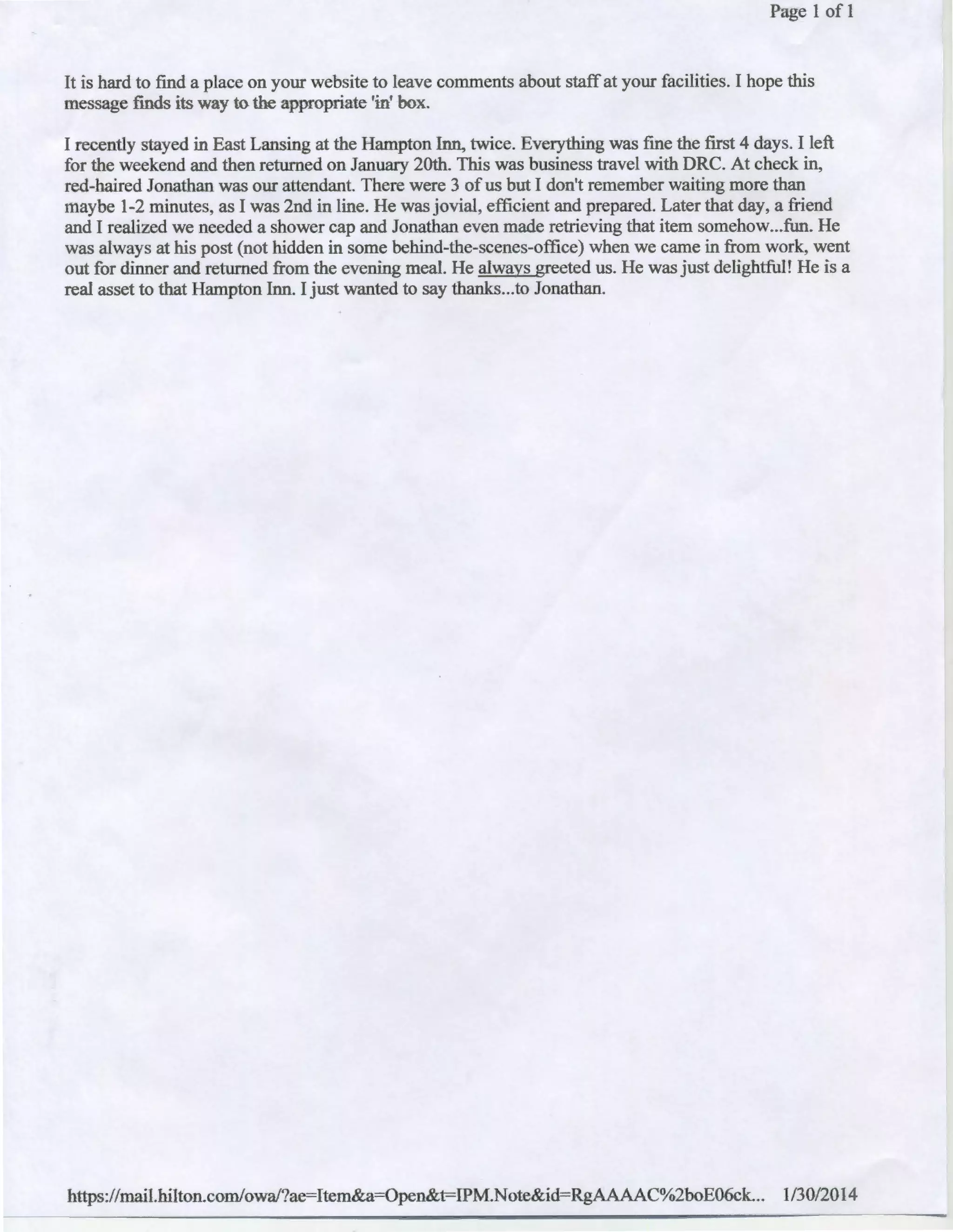 Jonathan provided excellent customer service as the attendant at the Hampton Inn in East Lansing during the author's two recent stays. The author commends Jonathan for being jovial, efficient, and always present at the front desk to greet guests as they came and went. Jonathan even made retrieving a needed shower cap an enjoyable experience. The author wanted to specifically thank Jonathan for being such a delightful and valuable asset to the Hampton Inn.