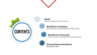 DrData-Indian Medical Directory Project aims to provide an online directory of medical doctors, centers, colleges and jobs in India. It benefits customers by giving them easy access to authentic information on doctors and medical services in their area. This helps people in emergency situations. The community benefits from increased awareness of medical information and nearby healthcare services. The project creator recommends tactics like advertising, branding, collaboration with medical organizations, and awareness events to promote the website and its authenticity.