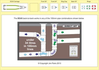 The document describes how to assemble and use a DC43 sewer nozzle cleaning device. It can be configured with different nozzle and ring combinations to clean pipes ranging from 100-150mm. The device cuts through blockages using a combination of 30 degree front and back nozzles. Rings are added to the front nozzle to enable cleaning of larger 150mm pipes with some cutting power provided to the front. Detailed images and instructions show how to assemble the device and switch between configurations.